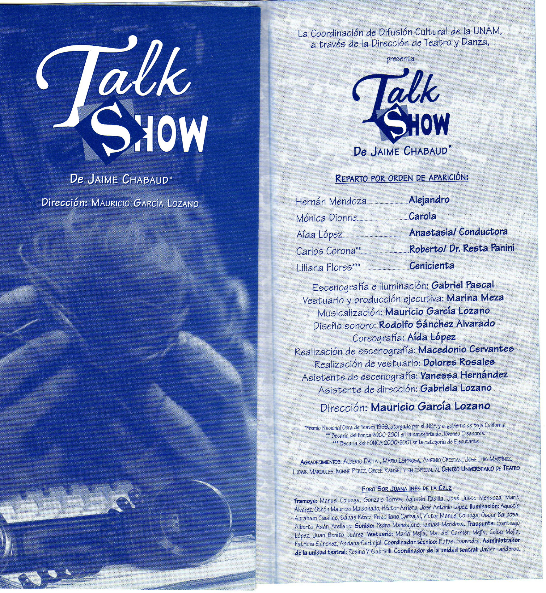 TALK SHOW, de Jaime Chabaud. Dir. Mauricio García Lozano. Con Hernán Mendoza, Mónica Dionne, Carlos Corona, Aída López y Liliana Flores. 2000
