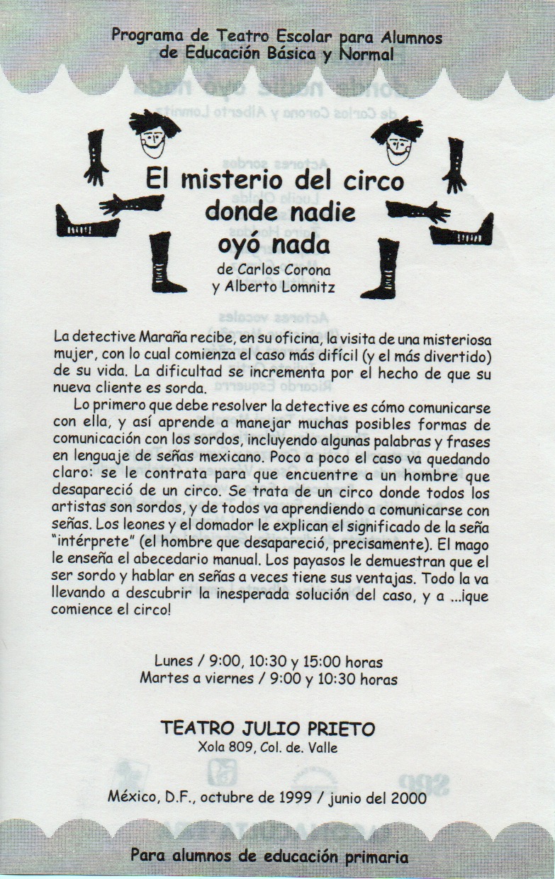 EL MISTERIO DEL CIRCO DONDE NADIE OYÓ NADA, de la compañía SEÑA Y VERBO. Dir. Alberto Lomnitz. INBA, CNT, SEP, CONACULTA, Teatro Julio Prieto (Xola) y Centro Cultural Helénico, entre otros. 1999
